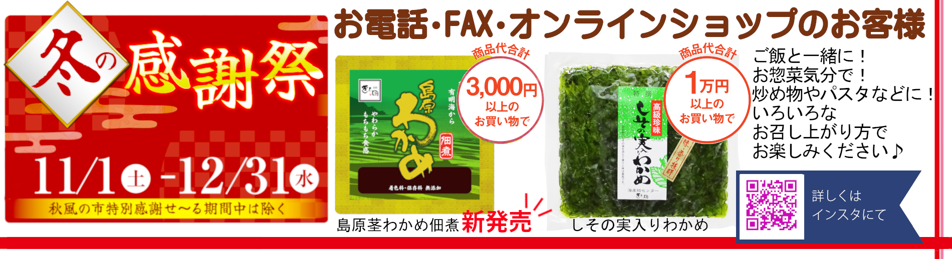 お電話・FAX・オンラインショップでご注文のお客様限定で、冬の感謝期間を実施しています!